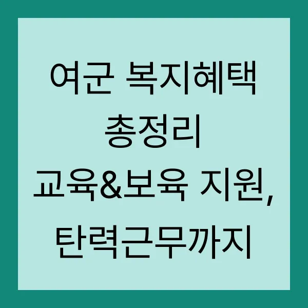 국가 안보를 굳건히 지키는 여군 여러분, 혹시 복지혜택에 대해 얼마나 알고 계신가요? 2025년 기준, 확 바뀐 최신 정보들을 꼼꼼히 정리했습니다! 교육&보육 지원부터 워라밸을 위한 탄력근무까지, 궁금했던 모든 혜택들을 지금 바로 확인하세요! 자녀 교육, 보육 걱정은 이제 그만~ 탄력근무로 일과 가정, 두 마리 토끼를 모두 잡으세요!