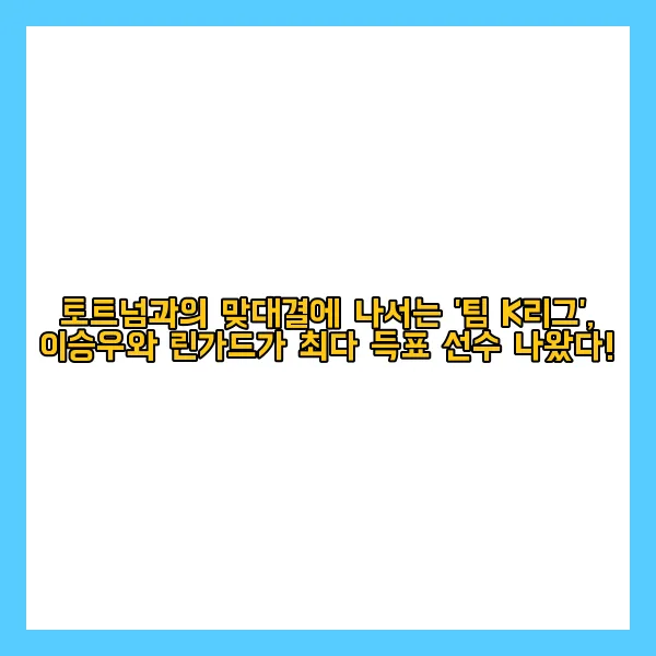 이번 팀 K리그와 토트넘의 맞대결은 국내외 축구팬들의 관심을 모으고 있습니다. 이승우, 린가드 등 팬 투표에서 돋보인 K리그 대표 선수들이 어떤 활약을 펼칠지 귀추가 주목되고 있죠. 31일 서울월드컵경기장에서 열리는 이 대결을 통해 팀 K리그가 국내외에 자신의 위상을 알릴 수 있을지 기대감이 높아지고 있습니다!